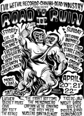 Today I am proudly introducing the ROAD TO RUIN FEST. For those of you who might not know, the Road To Ruin Fest is a completely independent punk/ rock & roll festival to be held in Philadelphia. The fest is being booked without the help of corporate sponsorship and everything is coming out of the pockets of the organizers. The organizers include Evil Weevil Records, Chikara Wrestling and Dead Industry.