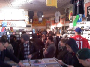 As many of you were probably aware, yesterday was the fourth annual Record Store Day. Hopefully you made it out to your local record shop and snatched up all the releases you wanted. That picture above shows the mob-scene that took place in Repo Records early on at about 10am. People were lined up out the door and around the corner and shortly after even some tempers began to flare, which is easily imaginable considering the madness (or because the releases people wanted weren’t available). Another big part of Record Store Day means live music and free shows, which is the other reason I’m here today. Later that day Phildephia’s own PURLING HISS melted faces for a mediocre-sized crowd at AKA Music, which immediately made me regret ever missing any past Purling Hiss shows. Hopefully after viewing the entire thirty minute performance below, you will be thinking the same exact thing.
